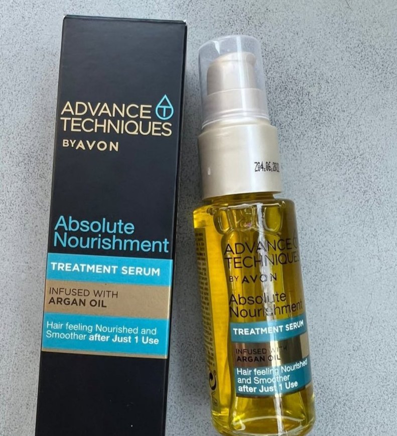 Avon Advance Techniques Absolute Nourishment Saç Serumu argan yağı içerir, tek kullanımdan sonra saçı besler ve daha yumuşak hissettirir. ✨
