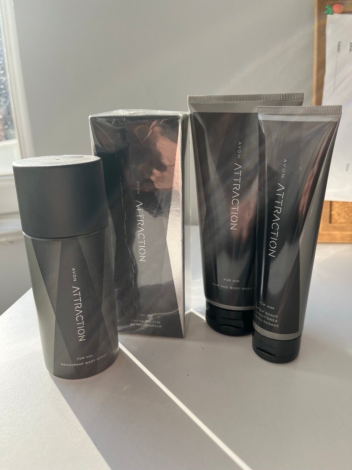 Avon Attraction erkek bakım seti:tam boy parfüm, losyon, deodorant ve vücut yıkama tüpü içerir, ferahlatıcı bir bakım sağlar.