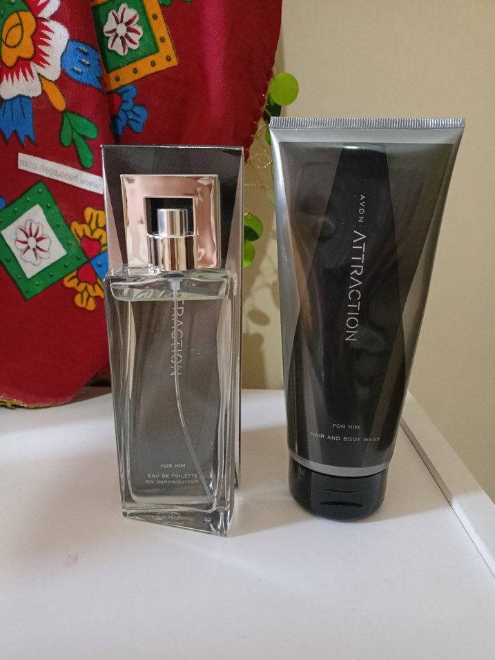 Avon Attraction erkekler için parfüm ve uyumlu vücut yıkama jeli içeren set.