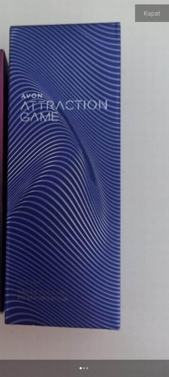 Avon Attraction Game kadın parfümü, modern ve çekici bir kokuya sahiptir. Ambalajı dalgalı desenlerle mavi renktedir.