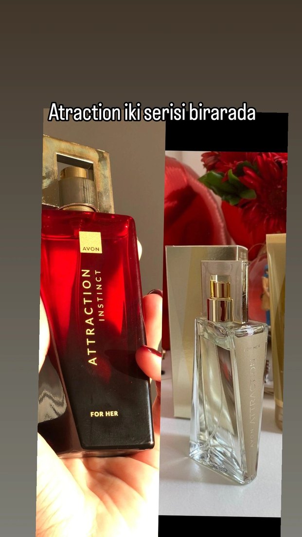 Avon Attraction serisi kadınlar için iki farklı parfüm içerir. Kırmızı şişe yoğun, etkileyici bir koku sunarken, şeffaf şişe daha hafif ve zarif bir aroma sağlar.
