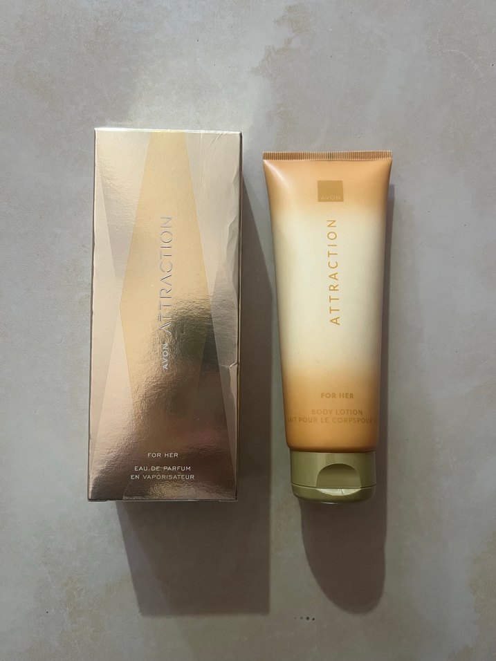 Avon Attraction kadın vücut losyonu, cildi yumuşak ve hoş kokulu yapar. Şık altın renkli tüp ve kutuda sunulur. Parfüm ve vücut losyonu set halindedir.