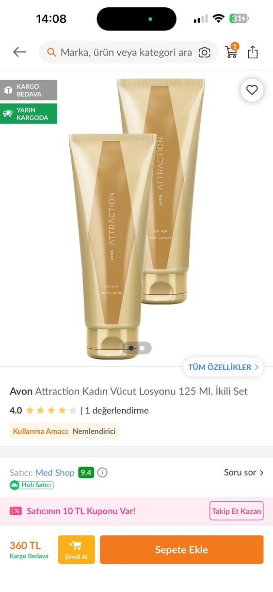Avon Attraction kadın vücut losyonu 125 ml ikili set halinde sunulur. Cildi nemlendiren ve yumuşak his bırakan formüle sahiptir.