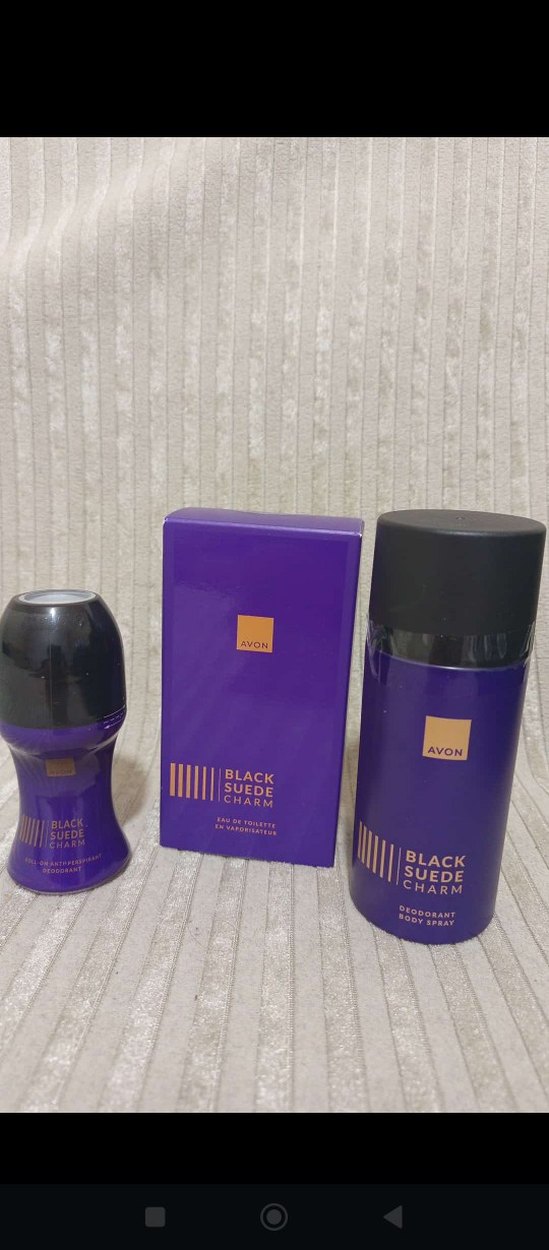 Avon Black Suede Charm erkek parfüm seti, koyu mor kutuda eau de toilette ve deodorant sprey içerir. Süet ve siyah notalarla gotik iş tarzı kokusu sunar.