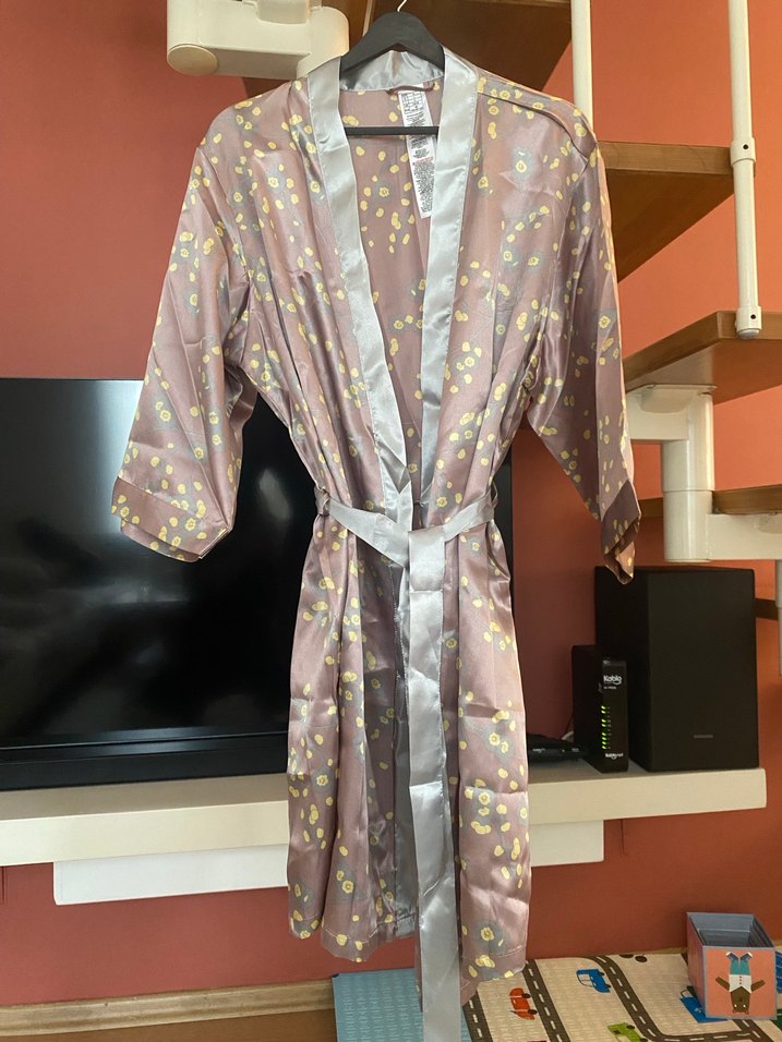 Gül kurusu tonlarında, bağlamalı ve bol kesim uzun sabahlık, hafif tie-dye desenli ve saten detaylıdır. Çok şık kaliteli sorunsuz.yurt dışından alındı hiç kullanılmadı.#penti#zara#teist
