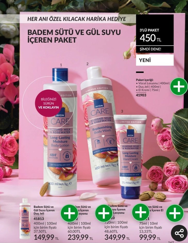 Avon Care paketi, badem sütü ve gül suyu içeren, 48 saat nem sağlayan vücut losyonu, duş jeli ve el kremi içerir.