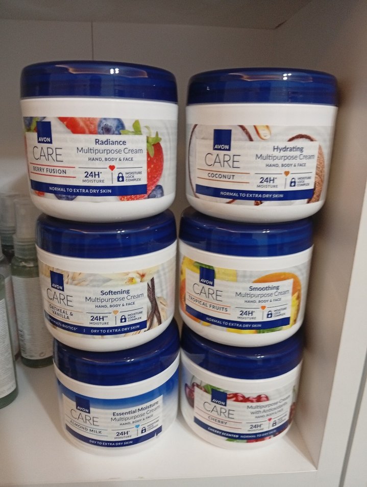 Avon Care çok amaçlı vücut kremleri, 24 saat nem ve parlaklık sağlar, hindistancevizi ve doğal özler içerir, kuru ve çok kuru ciltler için uygundur.