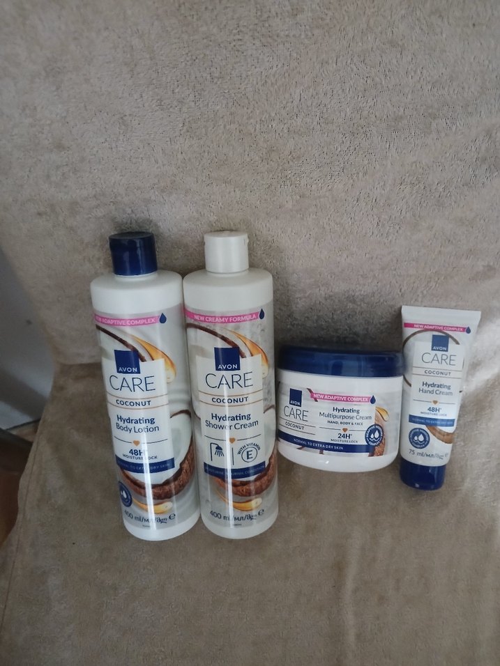 Avon Care Hindistan Cevizi vücut bakım seti; nemlendirici vücut losyonu, duş kremi, çok amaçlı krem ve el kremi içerir, 48 saat nem sağlar. sifir