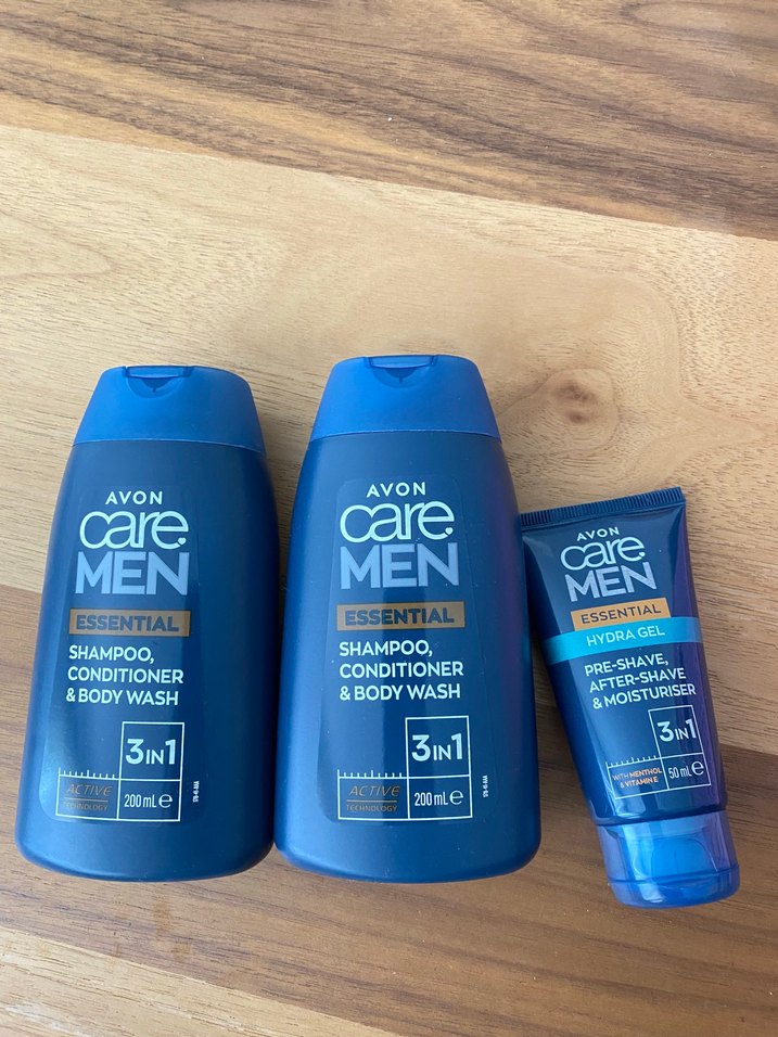 Avon Care Men Essential 3'ü 1 arada şampuan, saç kremi ve duş jeli (2 adet) ve tıraş öncesi, sonrası, nemlendirici hidro jel (1 adet) içerir. Hiç kullanılmadı.