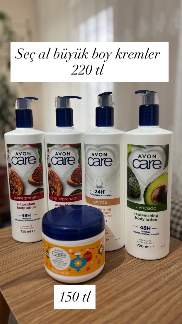 Avon Care 720 ml vücut losyonları; nar, hassas bakım ve avokado seçenekleriyle 24-48 saat nem sağlar. Sadece kutu krem vardır. Diğerleri satıldı.