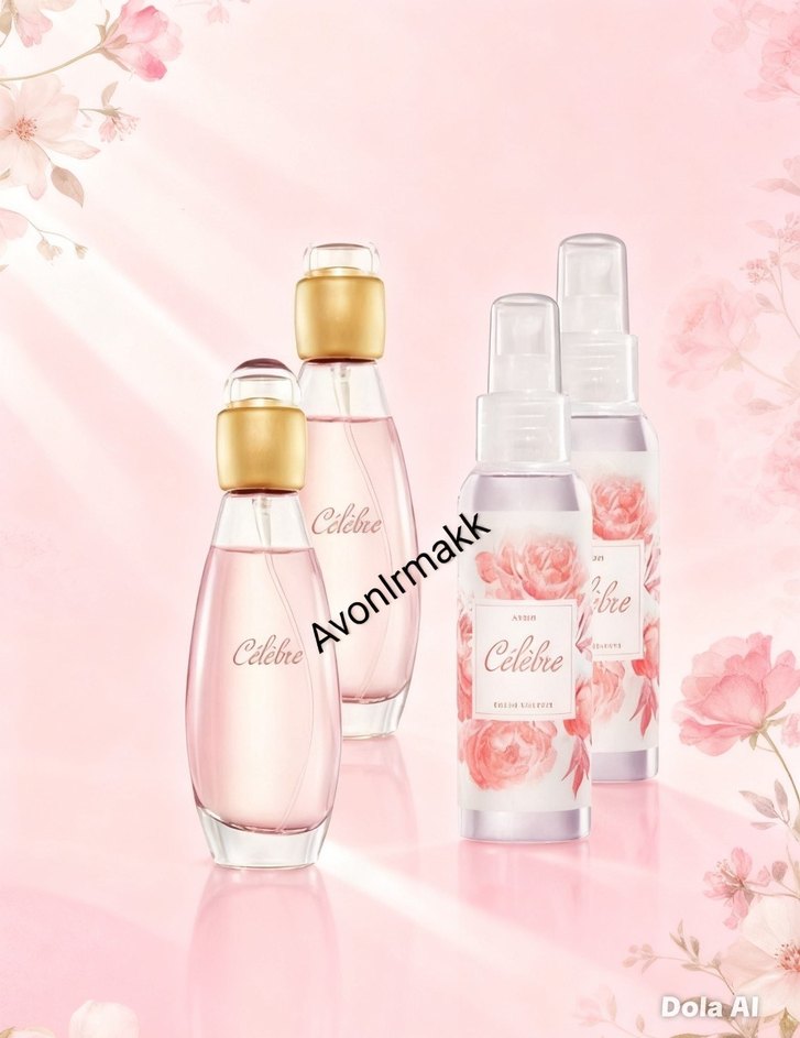 Avon Celebre kadın parfüm seti, şık pembe cam şişeler ve çiçek desenleriyle. Sette iki sprey ve iki klasik parfüm şişesi bulunur.