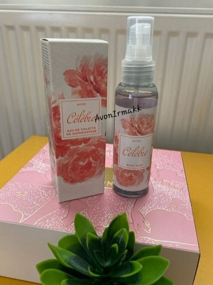 Avon Célebre kadın parfümü, çiçek desenli ve sprey şişede kolay kullanım sağlar.