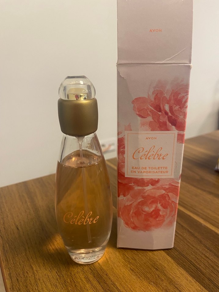 Avon Celebre kadın parfümü, çiçek desenli kutusunda, şeffaf cam şişesi ve altın kapaklıdır. Eau de toilette sprey olarak sunulur.