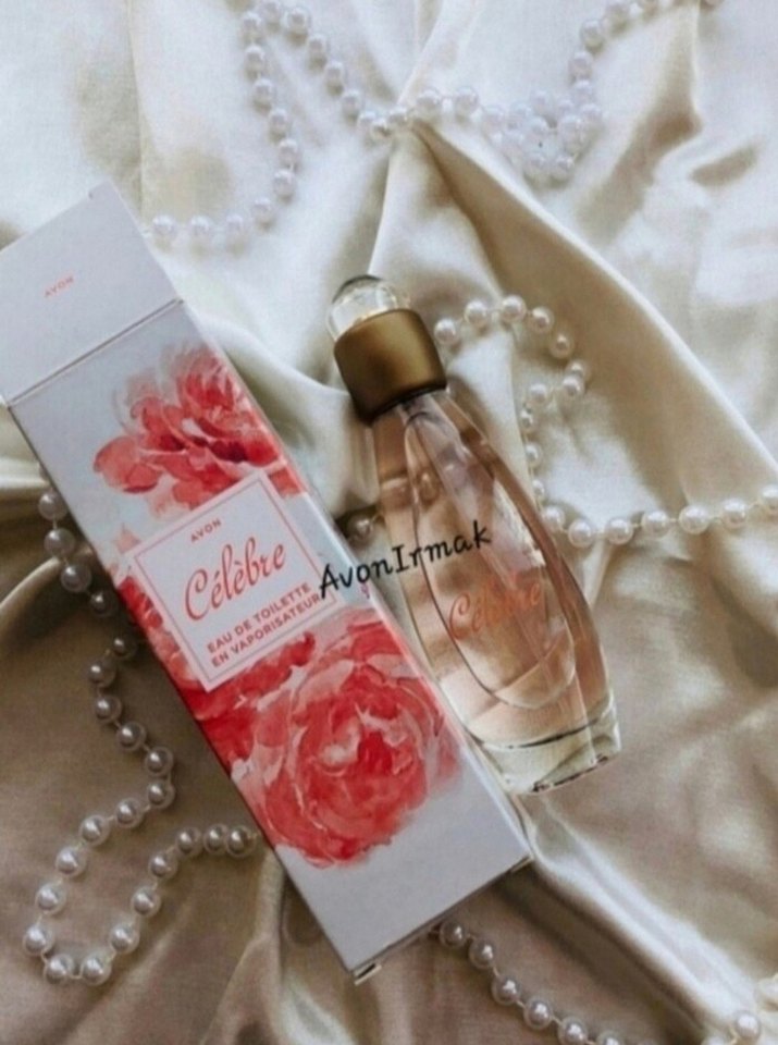 Avon Celebre kadın parfümü, çiçeksi notalara sahip, şık altın kapaklı şişede. Kutusu pembe çiçek desenlidir.