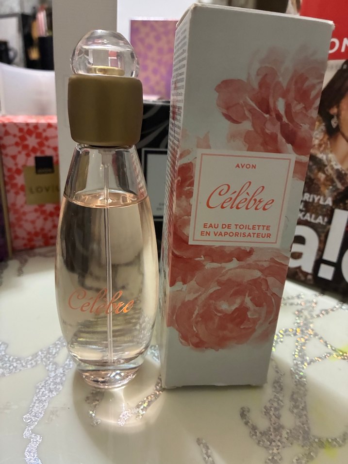 Avon Célebre kadın parfümü, altın renkli kapaklı şeffaf şişede ve çiçek desenli kutuda sunulmaktadır. Eau de toilette sprey olarak tasarlanmıştır.