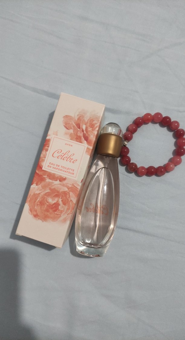Avon Celebre kadın parfümü, zarif ve çiçeksi bir kokuya sahiptir. Altın kapaklı şeffaf cam şişede sunulur.