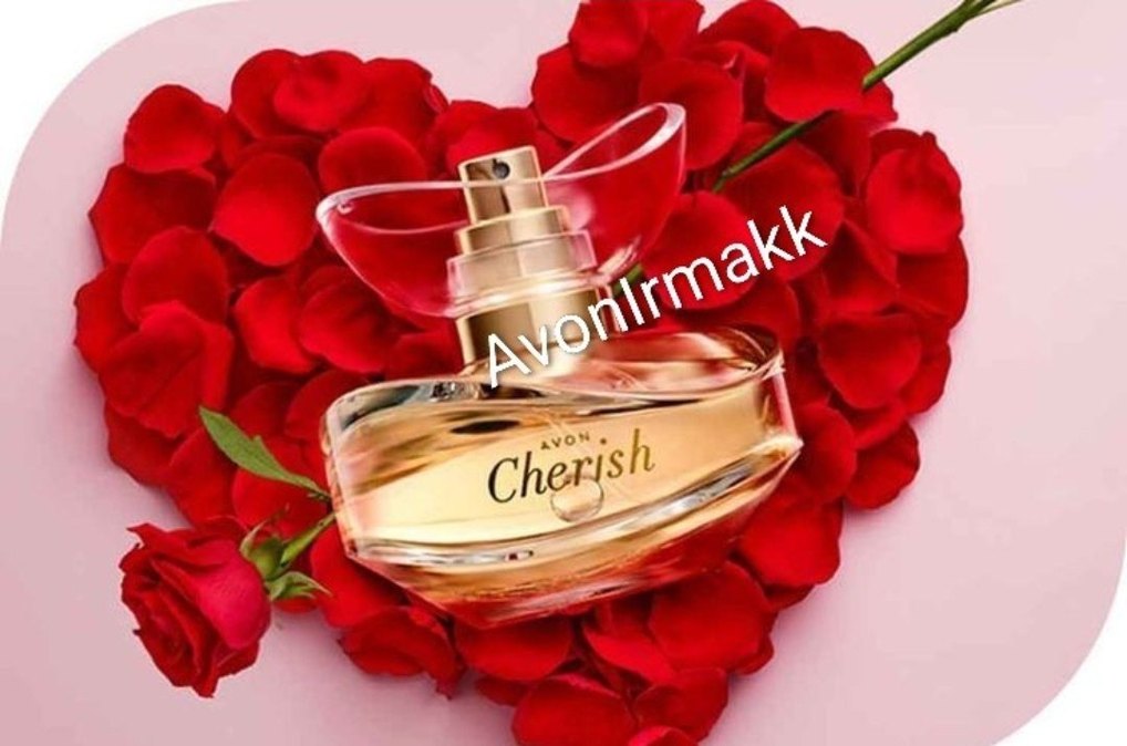 Avon Cherish kadın parfümü, altın renkli sprey başlıklı şeffaf cam şişede, çiçeksi kokusuyla. Gül yaprakları arasında.