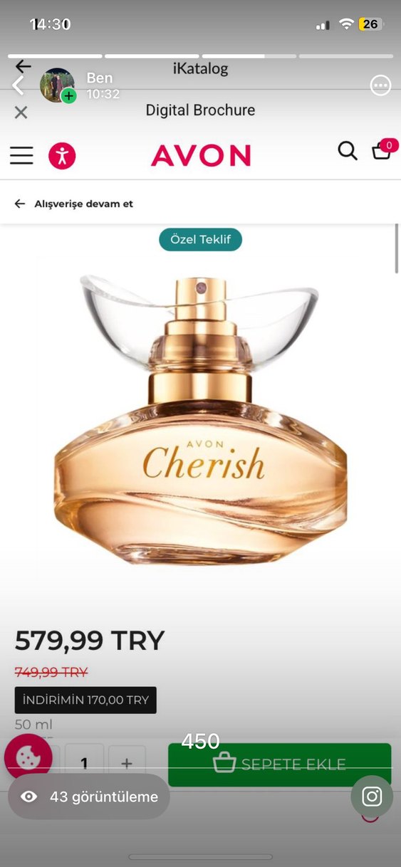Avon Cherish, şık şişesi ve altın renkli sprey başlığı ile kadın parfümüdür. Fiyatı 749,99 TRY'den 579,99 TRY'ye indirilmiştir.