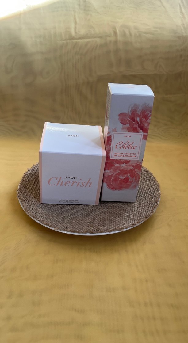 Avon Cherish Eau de Parfum ve Avon Célèbre Eau de Toilette içeren, çiçek desenli ambalajlı kadın parfüm seti.