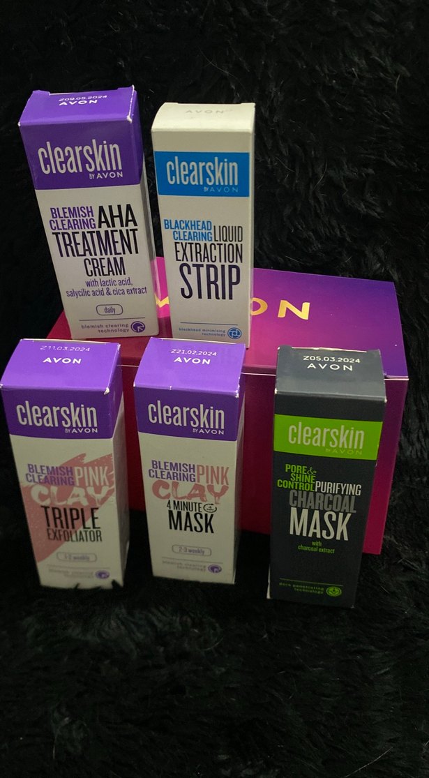 Avon Clearskin serisi; AHA krem, siyah nokta bandı, üçlü peeling, 4 dakikalık pembe maske ve kömürlü arındırıcı maske içerir. Gözenek ve parlaklık kontrolü sağlar.