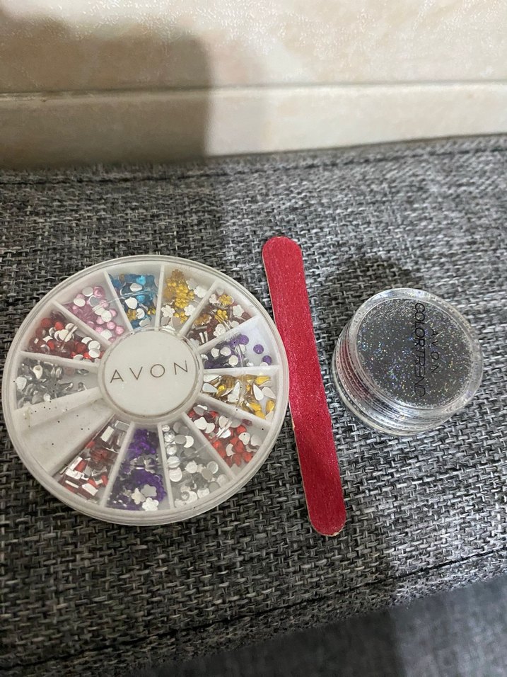 AVON çok renkli tırnak süslemeleri, gri tırnak törpüsü ve sim tozundan oluşan tırnak süsleme seti.