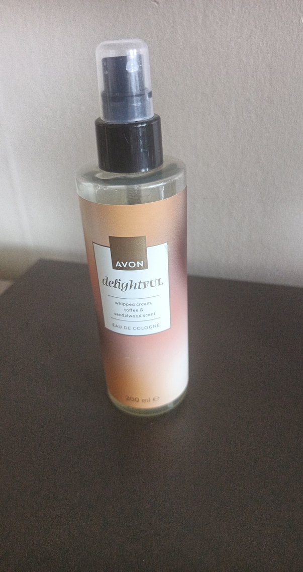 Avon Delightful kadın kolonyası, çırpılmış krema, karamelli ve sandal ağacı kokularına sahip 200 ml sprey şişede. ürün den bir iki fıs sıkılmıştır