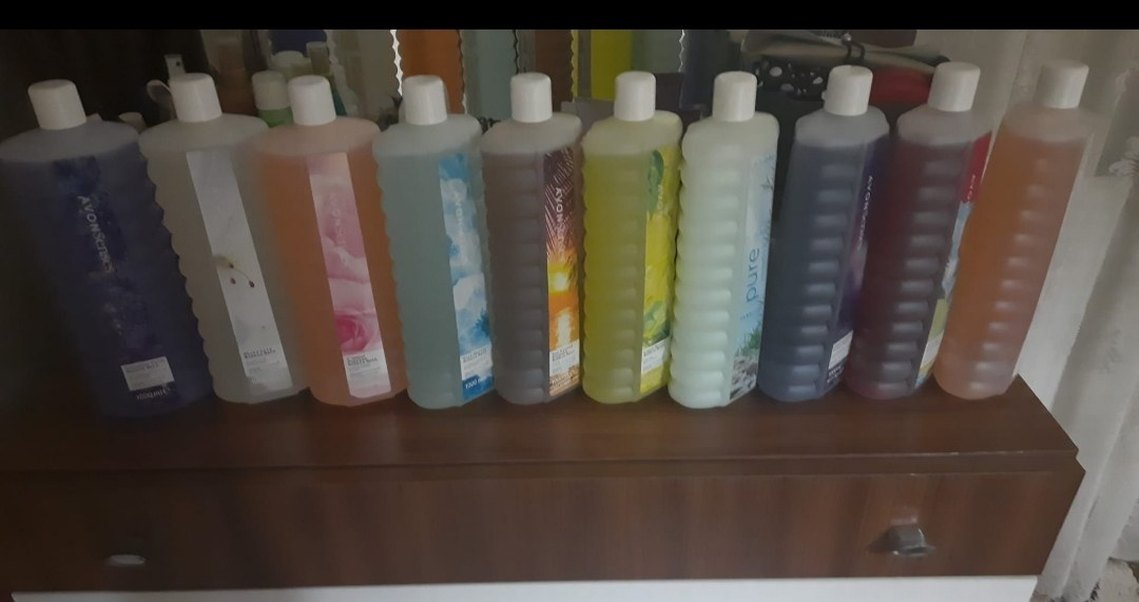 Avon duş jeli çeşitleri. Her şişe beyaz kapaklı ve jel renklerini gösteren yarı saydam gövdeli. 1 lt adet fiyatı 249 tl