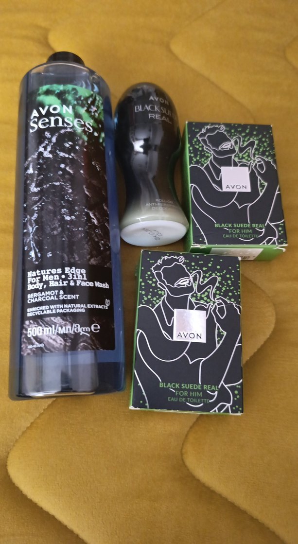 Avon erkek bakım seti; 500ml bergamot ve kömür kokulu vücut, saç ve yüz yıkama, Black Suede Real deodorant ve iki adet parfüm içerir. teklif sunmayınız lütfen iadesi yoktur