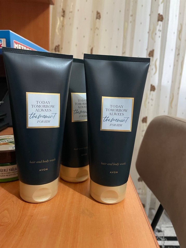 Avon'un Today Tomorrow Always erkekler için saç ve vücut yıkama jeli, ferahlatıcı bir temizlik sunar. Siyah tüpte, bej kapaklıdır. 3lü paket