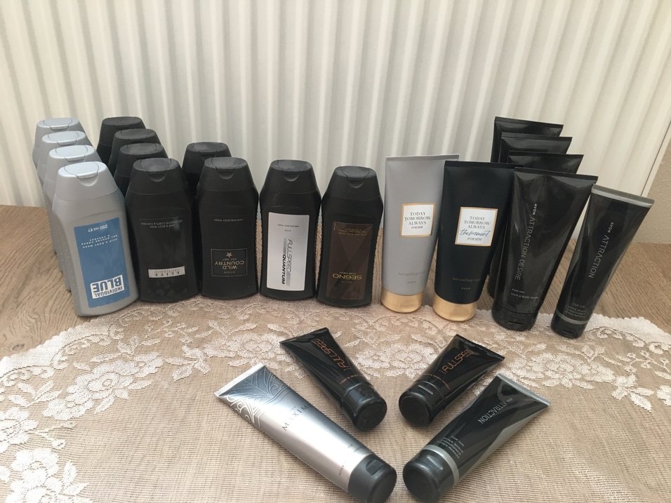 Avon erkek vücut bakım seti, günlük kullanım ve cilt tazeliği için çeşitli duş jelleri ve kremler içerir.