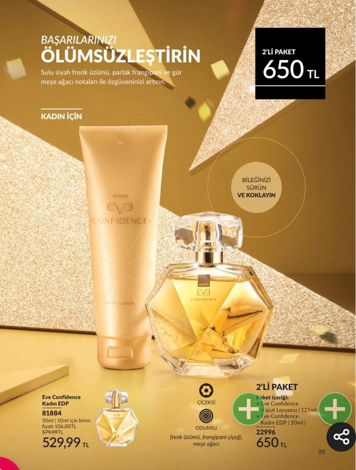 Avon Eve Confidence parfüm ve vücut losyonu seti, siyah frenk üzümü, parlak frangipani ve meşe ağacı notalarıyla özgüveni artırır. Set 50 ml parfüm ve 125 ml losyon içerir. sıfır ve yeni tarihlidir yanında numune hediyesi de mevcuttur