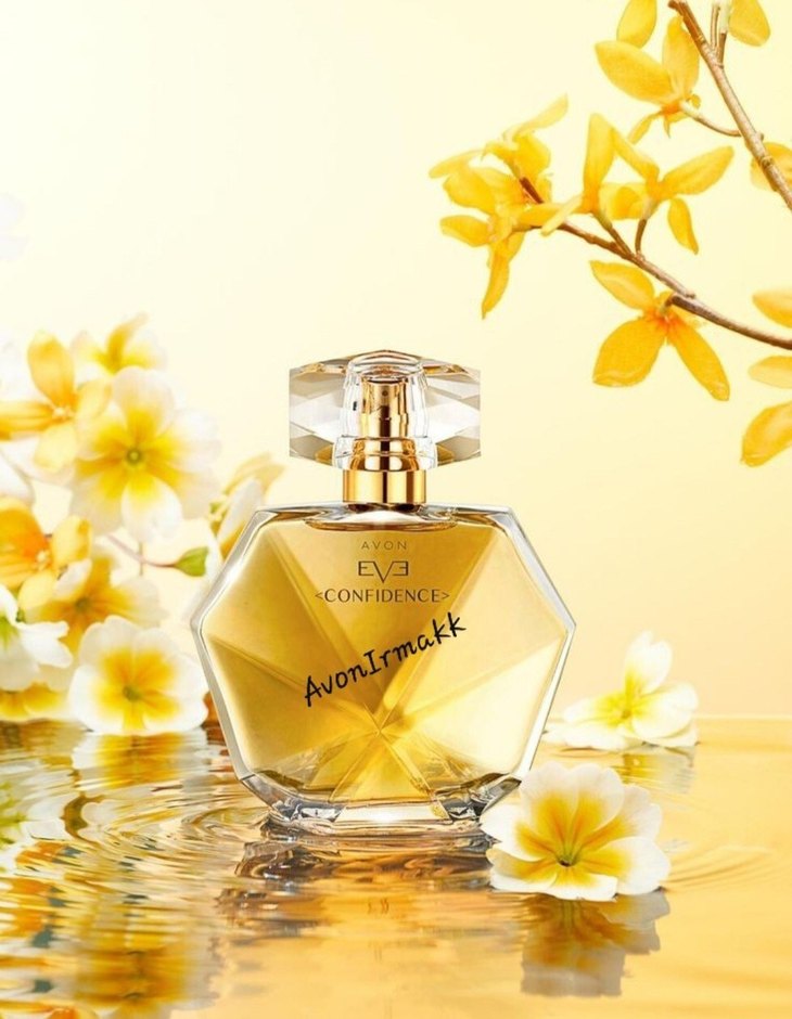 Avon Eve Confidence kadın parfümü, sarı çiçeklerle çevrili, keskin hatlı cam şişede altın tonlarında bir koku sunar.
