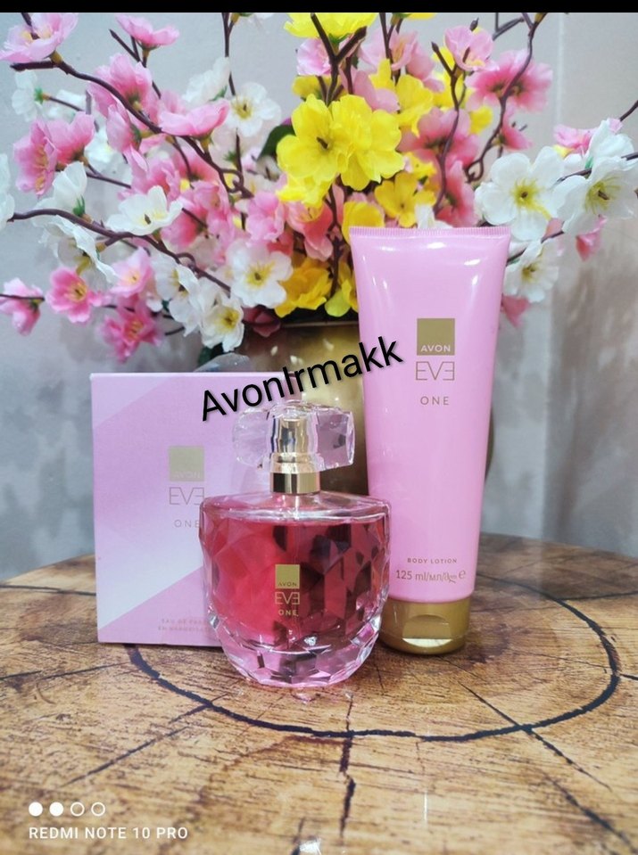 Avon Eve One kadın parfüm seti, çiçeksi kokulu parfüm ve uyumlu vücut losyonundan oluşur. Şişe keskin detaylı ve pembe ambalajda.