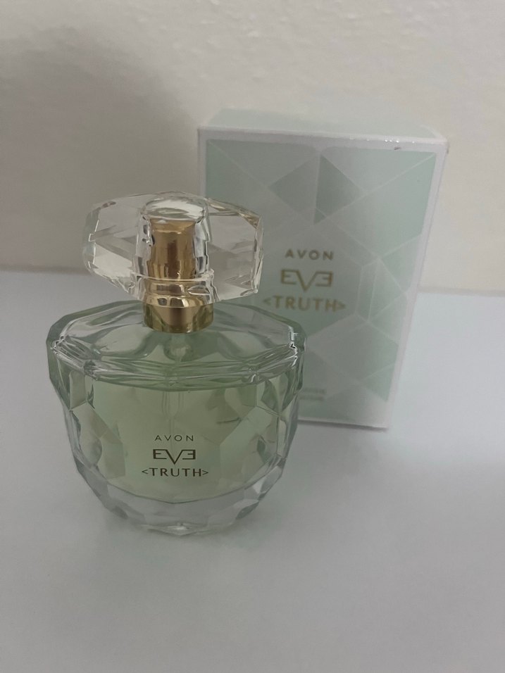 Avon Eve Truth kadın parfümü, altın renkli sprey başlıklı, keskin cam şişede ve açık renkli kutuda sunulur. Ürün sıfırdır kutusunda gönderilecektir