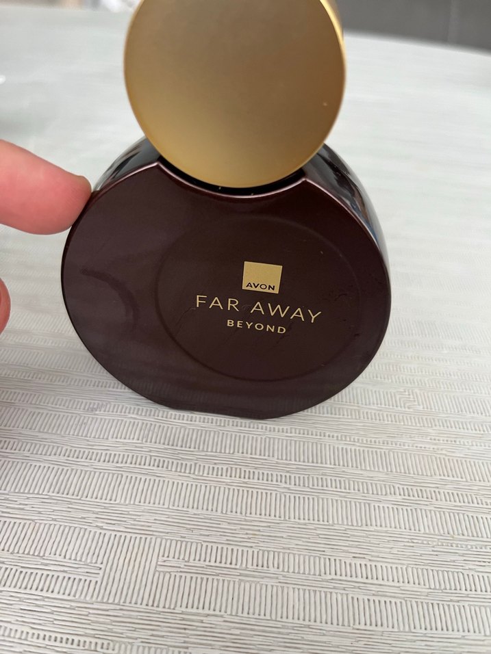Gösterdiğim yere kadar doludur Avon Far Away Beyond, koyu şişede ve altın kapaklı kadın parfümüdür.