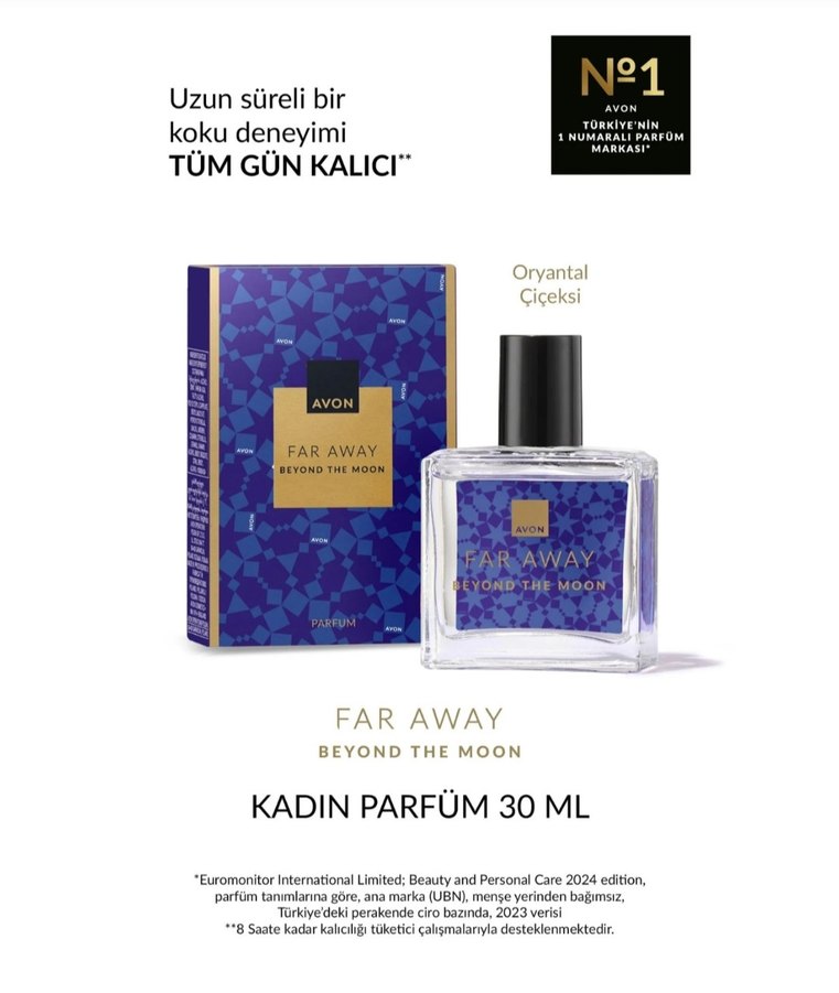 Avon Far Away Beyond The Moon, 30 ml kadın parfümü olup oryantal çiçeksi kokusuyla tüm gün kalıcı bir koku deneyimi sunar. 8 saate kadar kalıcılığı desteklenir.