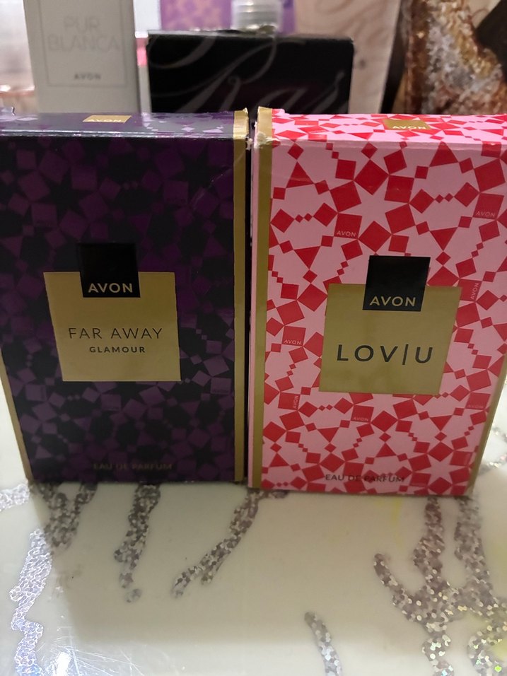 Avon Far Away Glamour ve Loviu kadın parfümleri, mor ve pembe desenli kutularda, şık koku seçenekleri sunar.