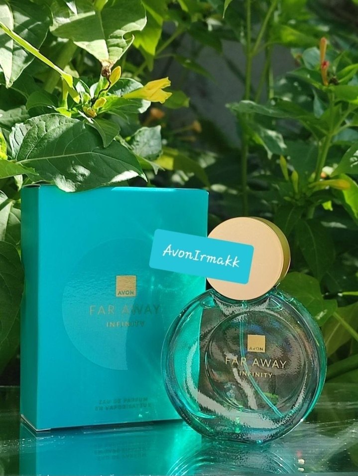 Avon Far Away Infinity kadın parfümü, turkuaz şişe ve altın kapaklı, ferah ve zarif kokusuyla dikkat çekiyor.
