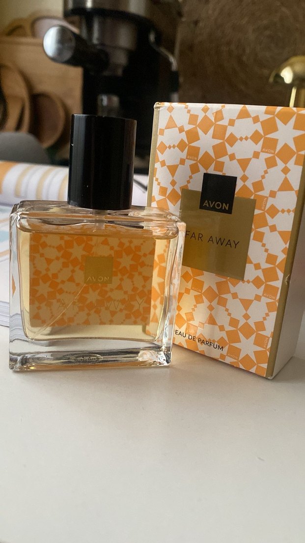 Avon Far Away, floral desenli kutusu ve siyah kapaklı şeffaf cam şişesiyle kadın parfümüdür.