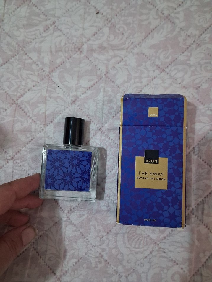 Avon Far Away kadın parfümü, şeffaf cam şişede kendine özgü kokuya sahip. Koyu mavi etiket ve siyah kapak bulunur.