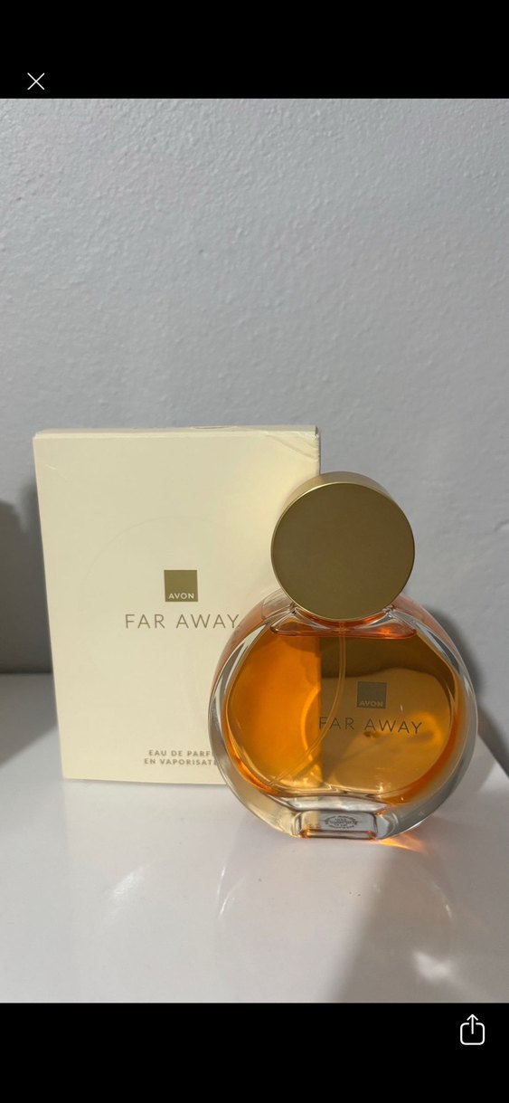 Avon Far Away kadın parfümü, yuvarlak şişede altın kapaklı. Hiç kullanılmadı