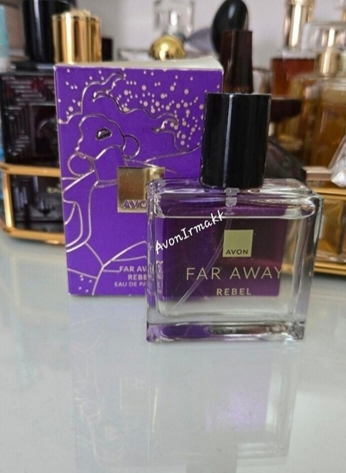 Avon Far Away Rebel kadın parfümü, siyah kapaklı şık cam şişede ve çiçek desenli mor kutuda sunulmaktadır.