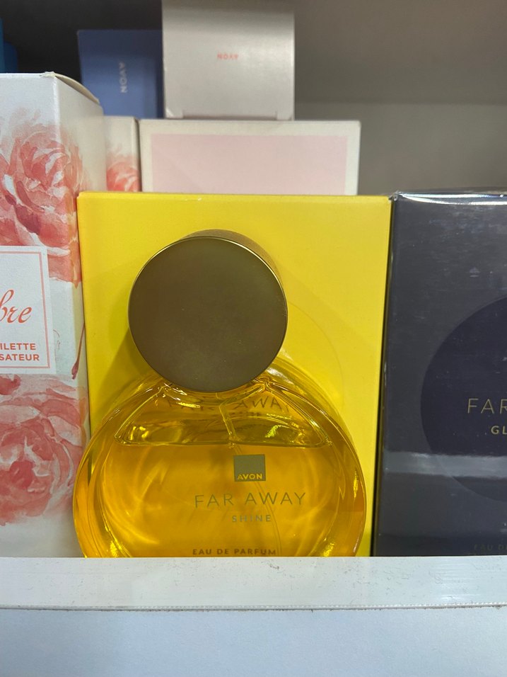 Avon Far Away Shine kadın parfümü, altın kapaklı parlak sarı şişede sunulur ve kendine özgü bir koku deneyimi sağlar.