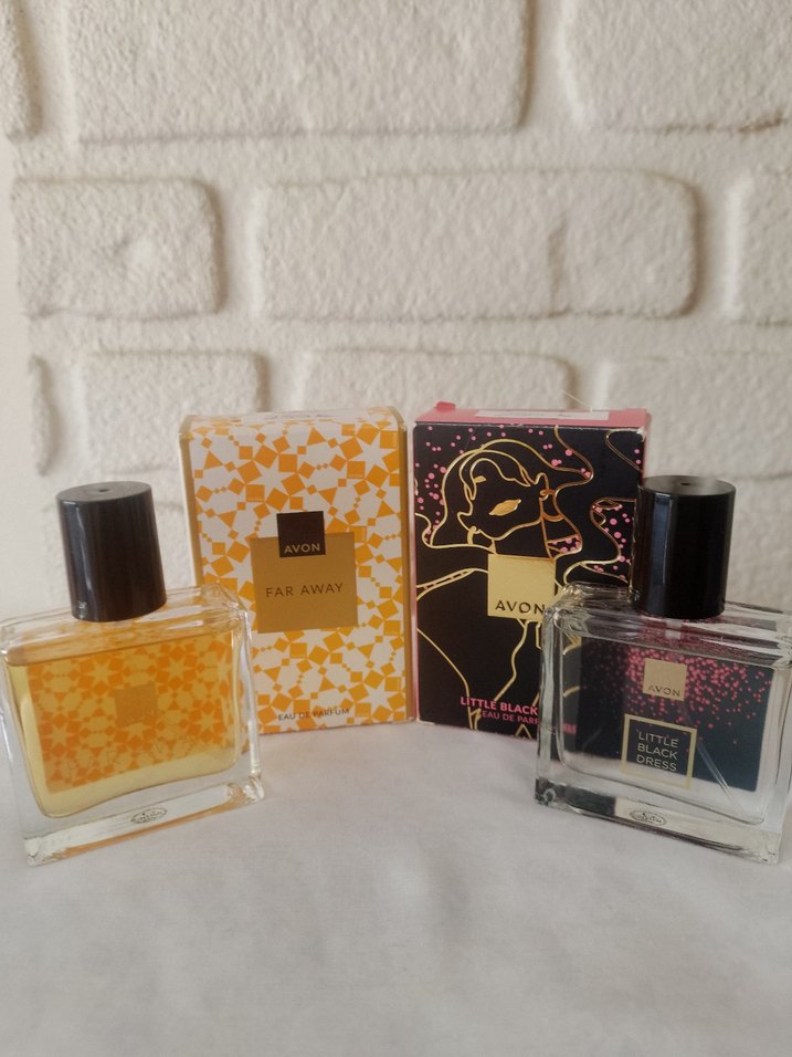 Avon markasına ait Far Away ve Little Black isimli iki kadın parfümü, siyah kapaklı şeffaf şişelerde, kutularıyla birlikte.