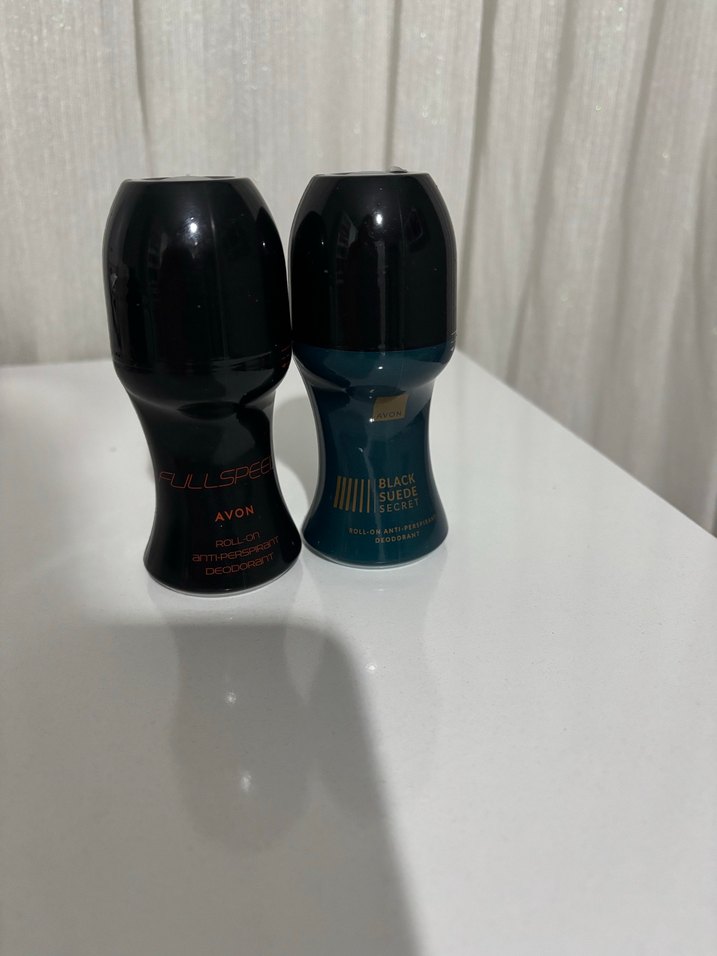 İki adet koyu renkli erkek roll-on deodorant, Avon Full Speed ve Black Suede, minimalist tarz ve etkili koku koruması sağlar.