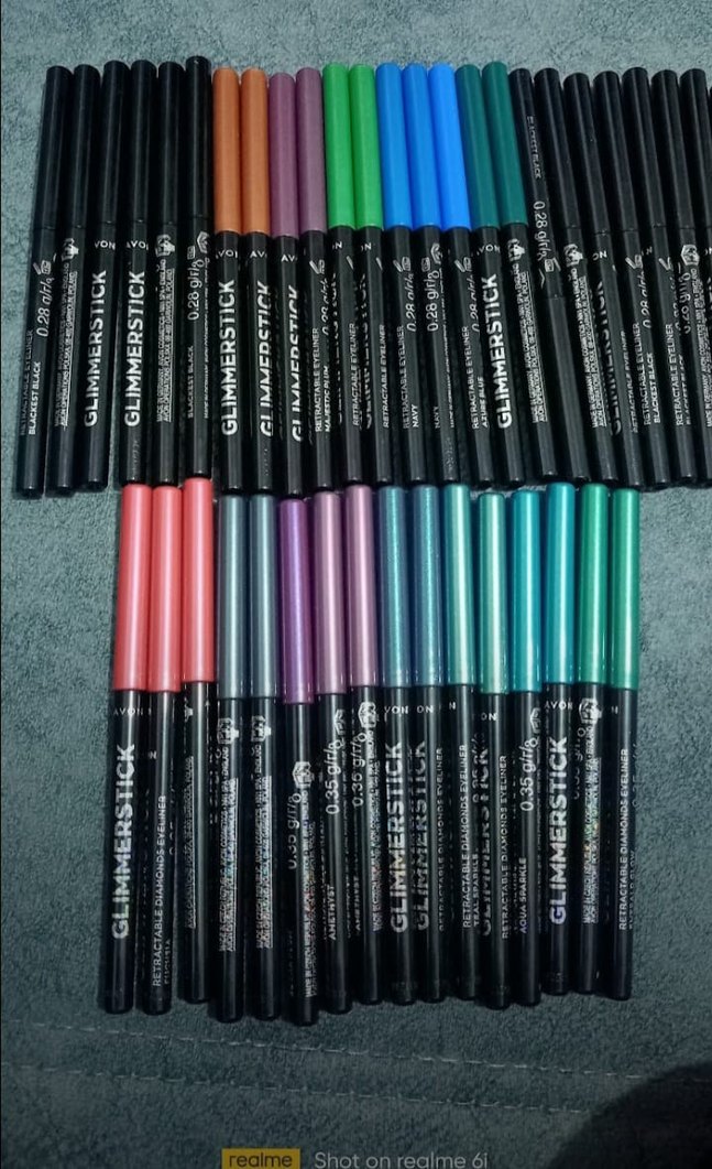 Çok renkli, koyu tonlarda Glimmerstick marka göz kalemleri seti, çeşitli renk seçenekleri sunar.