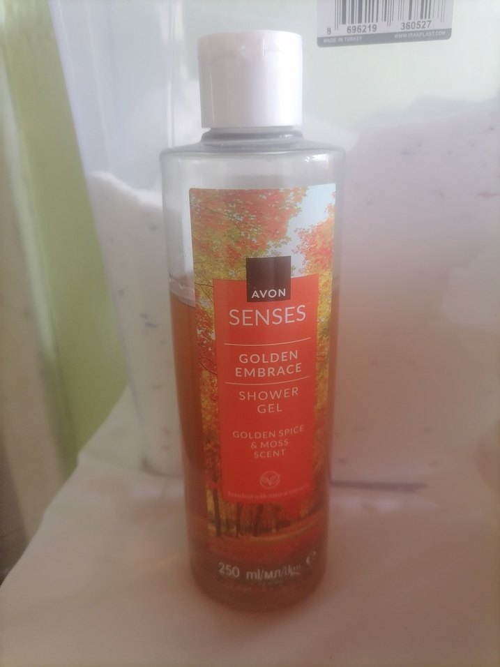 Avon Golden Embrace duş jeli, 250 ml şişede sıcak baharat ve yosun kokusu sunar. Cildi nazikçe temizler ve ferahlatıcı bir deneyim sağlar.