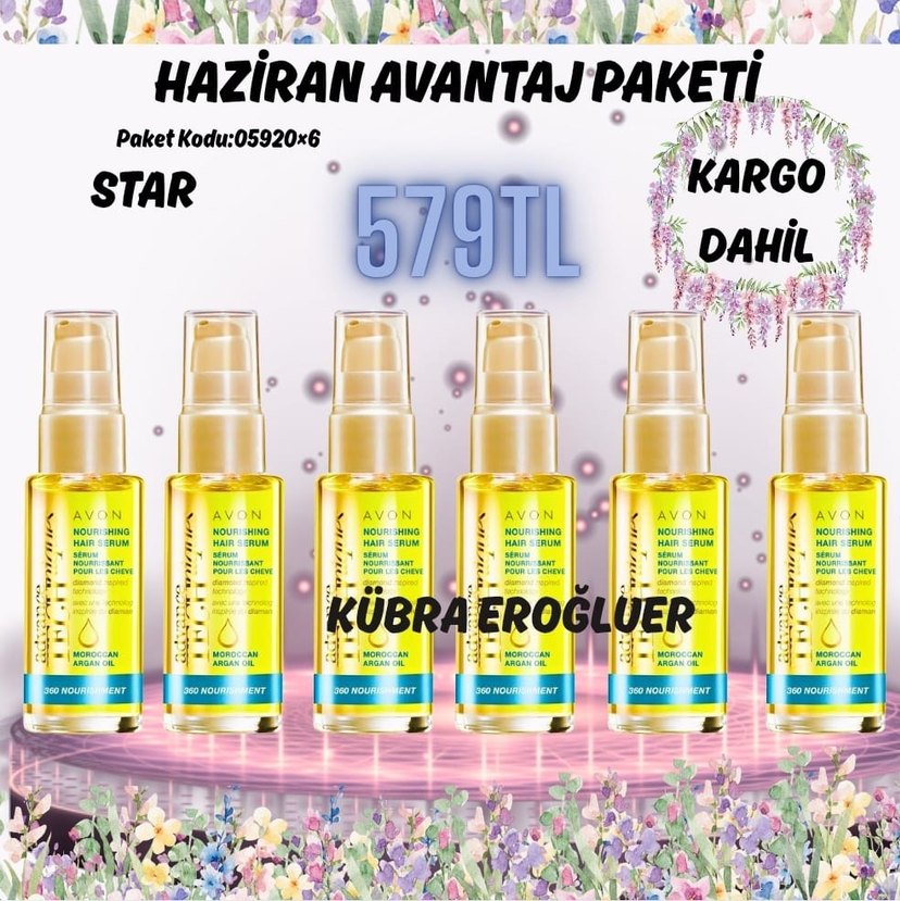 Avon Haziran Avantaj Paketi, argan yağı içeren besleyici saç serumları içerir. 579 TL fiyatıyla saç bakım ürünleri seti sunar.