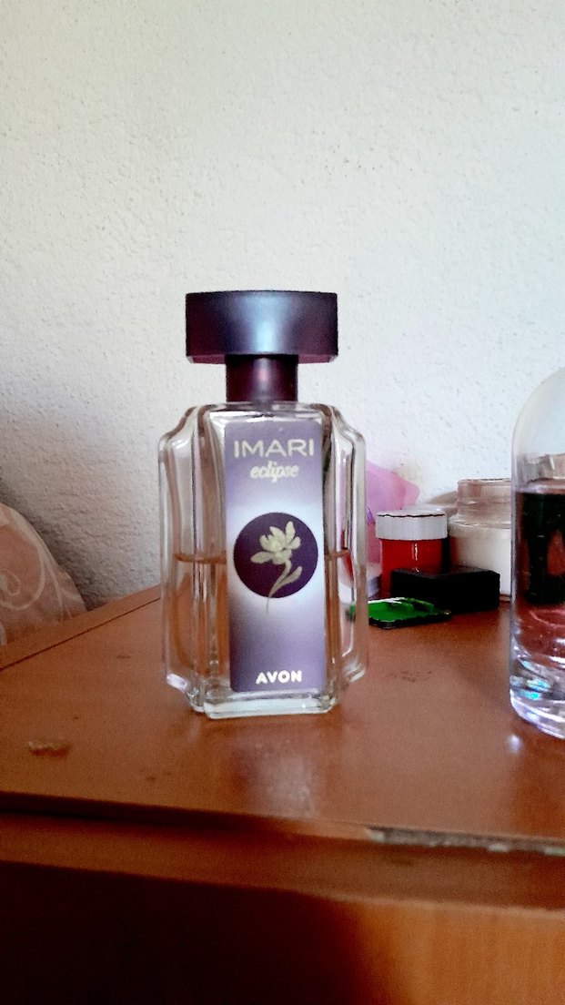 Avon Imari Eclipse, çiçeksi kokulu kadın parfümü, şeffaf cam şişede koyu mor kapakla sunulur.