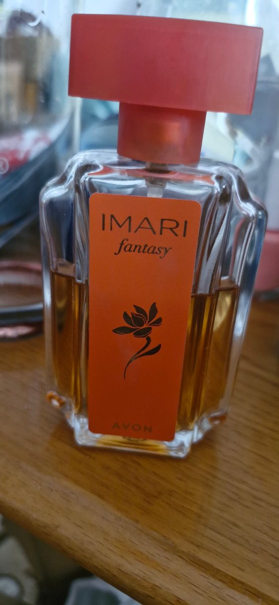 Avon Imari Fantasy kadın parfümü, turuncu etiketli ve kapaklı şeffaf cam şişede çiçeksi esans sunar.